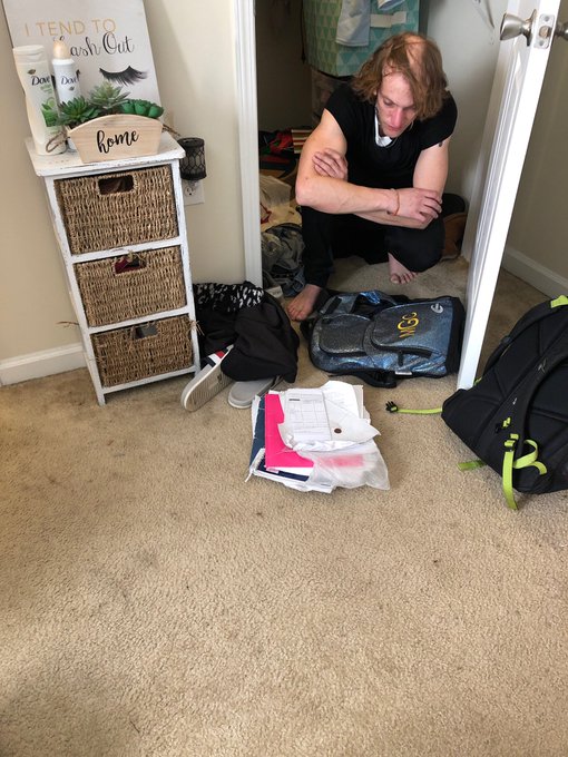 She opened the door, and sitting on the floor was a tall, lanky man with greasy hair, wearing her clothing, shoes, and socks. He also had stuffed a bag with her belongings.