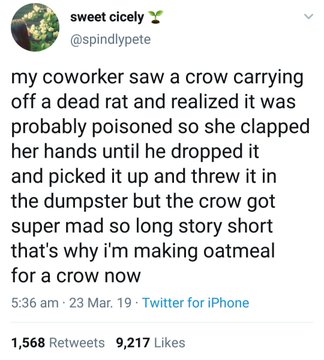 This thread from a gal who tried to help save a crow is quite honestly one of the funniest things this editor has read in a long time and a nice break from all of the shaking fists in politics.