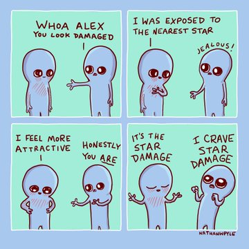 Pyle's comics focus on a group of tiny space aliens trying to understand the world around them, navigating familiar things like birthdays, dinner parties, sunburns, and even current events, but in a cute, unexpected — and often completely inoffensive — way.