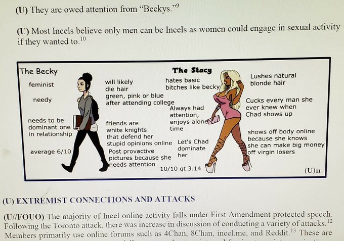 At least one Air Force base is on the lookout for a sinister new threat: angry men who can’t get laid.Personnel at Joint Base Andrews in Maryland were recently treated to a threat brief regarding an “increase in nationwide activity” by self-described “incels,” members of an online subculture of “involuntary celibacy” who adopt an ideology of misogyny, mistrust of women, and violence in response to their failed attempts at romantic relationships.…Indeed, the screenshot appeared the day after Brian Isaack Clyde, a former Army infantryman who frequently posted memes that referenced the incel movement alongside anti-government conspiracies to his Facebook page, was shot by federal officers after he opened fire outside a Dallas, Texas federal building.The screenshot features a reproduction of an internet meme popular among incels known as “Becky vs. Stacy.” A derivative of the ‘Virgin Walk’ or ‘Virgin vs. Chad’ meme that contrasts awkward virgin incels against an imaginary hyper-masculine bro known as Chad, the Becky vs. Stacy meme purportedly reflects how incels judge women based solely on their physical features.Incels believe “they are owed attention from ‘Beckys,'” the Joint Base Andrews brief reads. “Most Incels believe only men can be Incels as women could engage in sexual activity if they wanted to.”