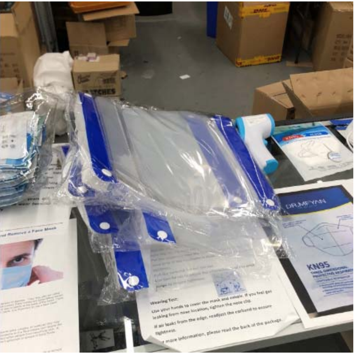 Images from the criminal complaint showing the personal protective equipment that Singh allegedly sold in his store.