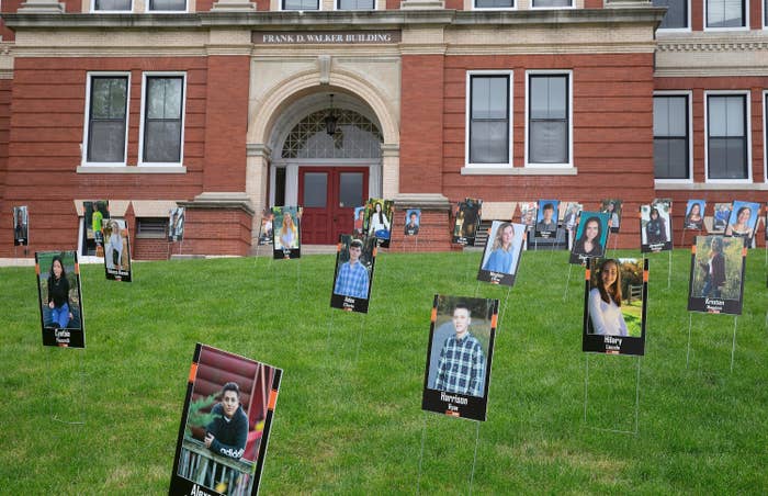 Senior portraits on display at Frank D. Walker Building in Marlborough, Massachusetts, May 18.