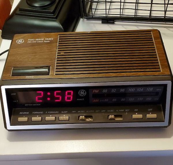GE two alarm clock – this guy has been waking me up since I purchased it new in 1991. It has never failed me with a 9 volt battery backup.